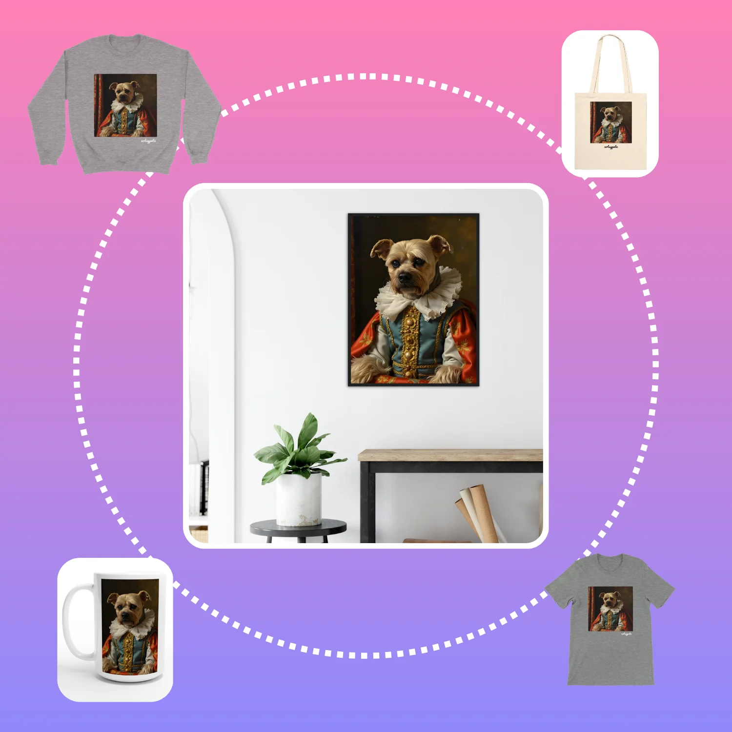 Upload your favorite photos, select your favorite portrait, and choose from a range of high-quality products to showcase your pet’s unique charm.